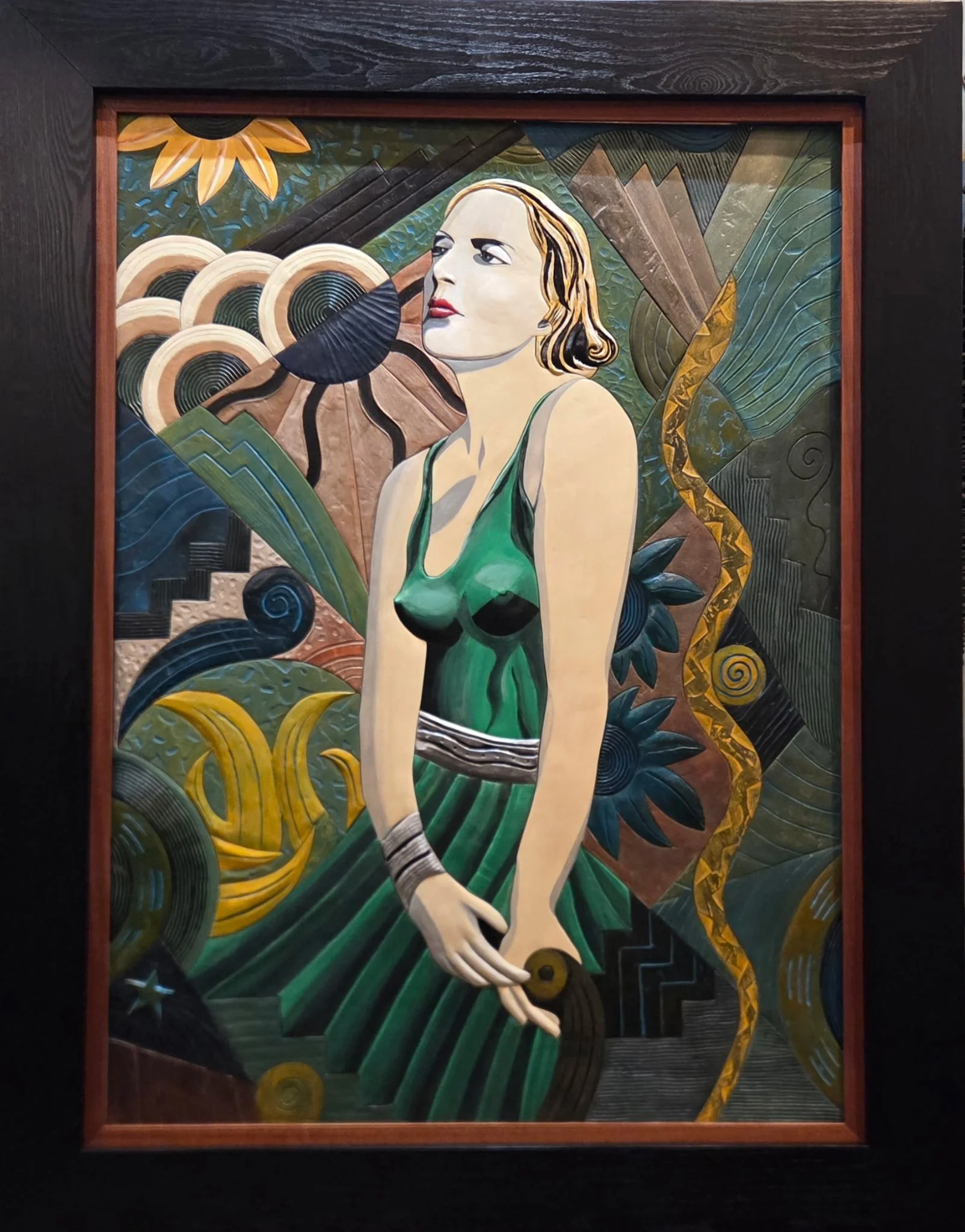Acrylic, enamel, and rubbed oil paint over hand-textured cut pieces on a fiberglass foam panel