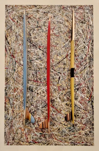 1960’s inspired wooden sculpted vintage boards (each approx 28 inches long), floating on a dynamic acrylic paint splashed backdrop.